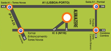 Lisboa A1 sentido norte, saída Torres Novas > IP6/A23 saida Tomar > IC3/N110 Direcção Coimbra