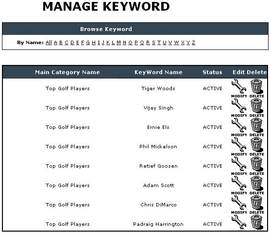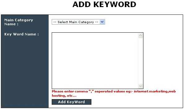 2. Manage Keyword : This deals with the management of keywords. All the keywords with the associated Categories are listed here. Facility for editing/deleting and even changing the status of the keyword is provided. Only the keywords with ‘Active' Status are used. Option for searching keyword is also provided.