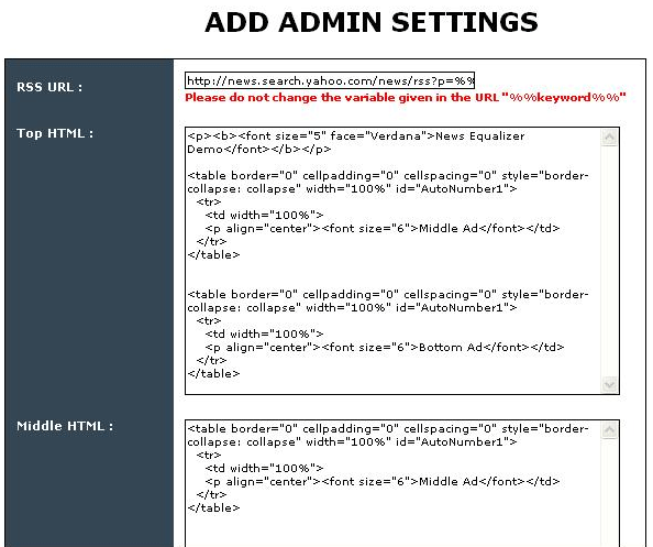 Middle HTML: The code added here would be displayed just below of the ‘headline news' in the main-page, and in the middle of the news-links in each keyword page.